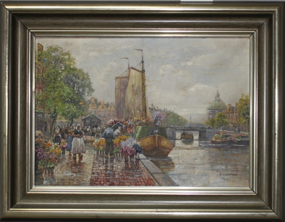68 Hornemann, R. [Sara Johanne Rein Hornemann oder Sara Johanne Rejn Robertsdatter Hornemann]. (Blumenmarkt in Amsterdam). Ölmalerei auf Leinwand (Mischtechnik). Unten rechts signiert “R. Hornemann“, Malerei aus den 1950er Jahren. Bildgröße 50 x 35 cm. Rahmengröße 65 x 50,5 cm (Querformat). (42)