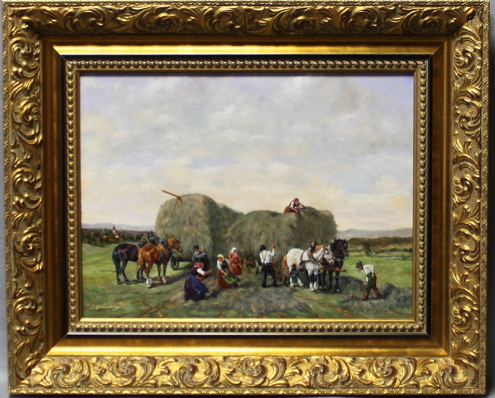 69 Lohmann, Adolf. “Die Heuernte“. Ölmalerei auf dünner Holzplatte (Mischtechnik). Unten links signiert “A.Lohmann“, Malerei aus den 1980er Jahren. Bildgr. 40 x 30 cm. Rahmengr. 56 x 46 cm (Querformat). (42)