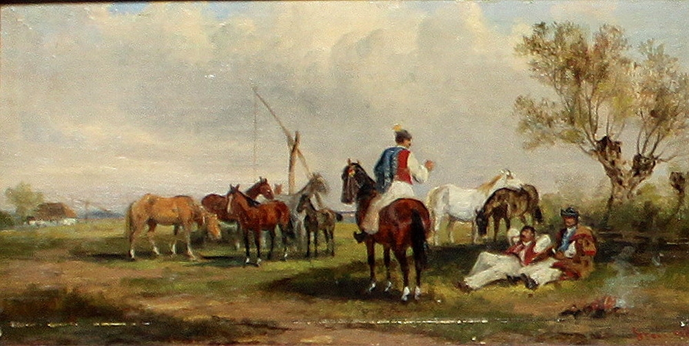 für den Künstler klassisches Motiv mit Reitpferden und figürlicher Staffage.