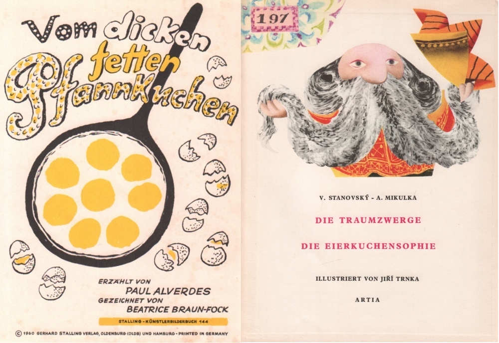 129 Kinderbuch. Alverdes, P. Vom dicken fetten Pfannkuchen. Oldenburg / O., Stalling, 1960. 4°. Mit bunten Bildern von Beatrice Braun – Fock, 8 Blätter. Orig. farbig illustrierter Pappband. (29)