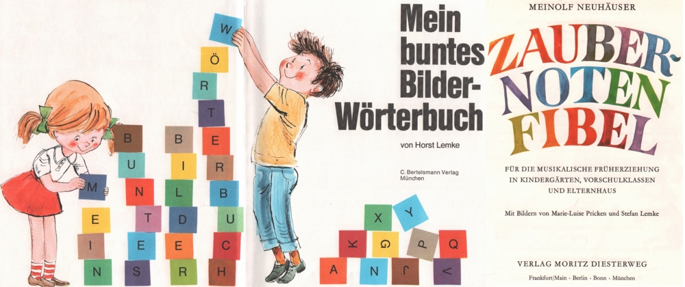 151 Kinderbuch. Wörterbuch. Lemke, H. Mein buntes Bilder – Wörterbuch. München, Bertelsmann, 1970. // M. Neuhäuser. Zauber – Noten Fibel. Musikalische Früherziehung …. Frankfurt / M. Diesterweg, 1968. Beides 4°. Mit bunten Abb. Orig. farbiger Pappband und orig. geheftet. (29)