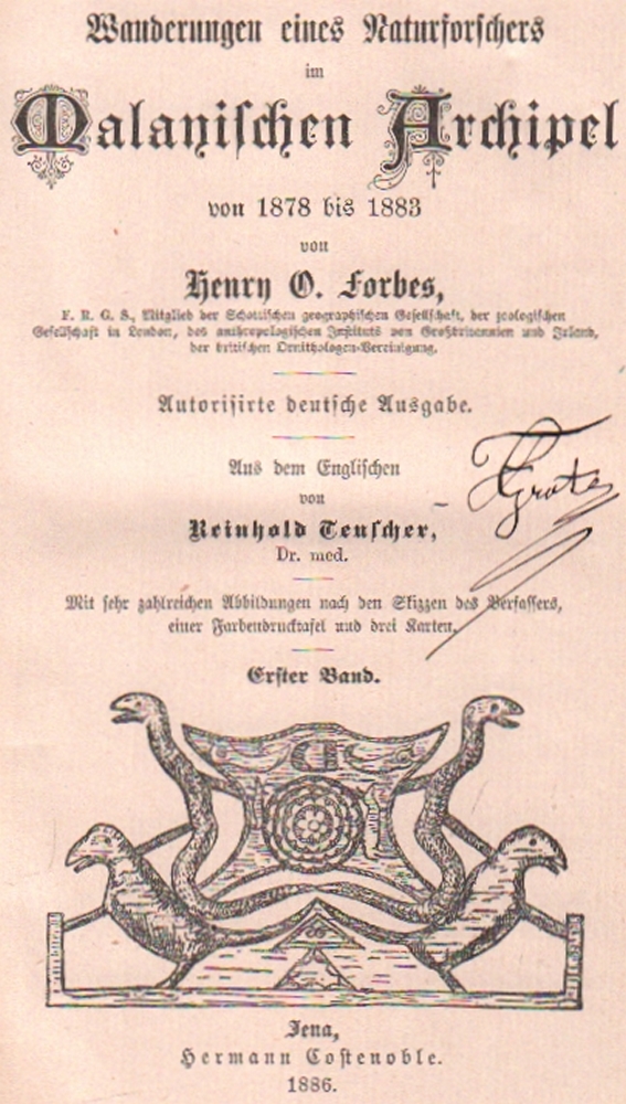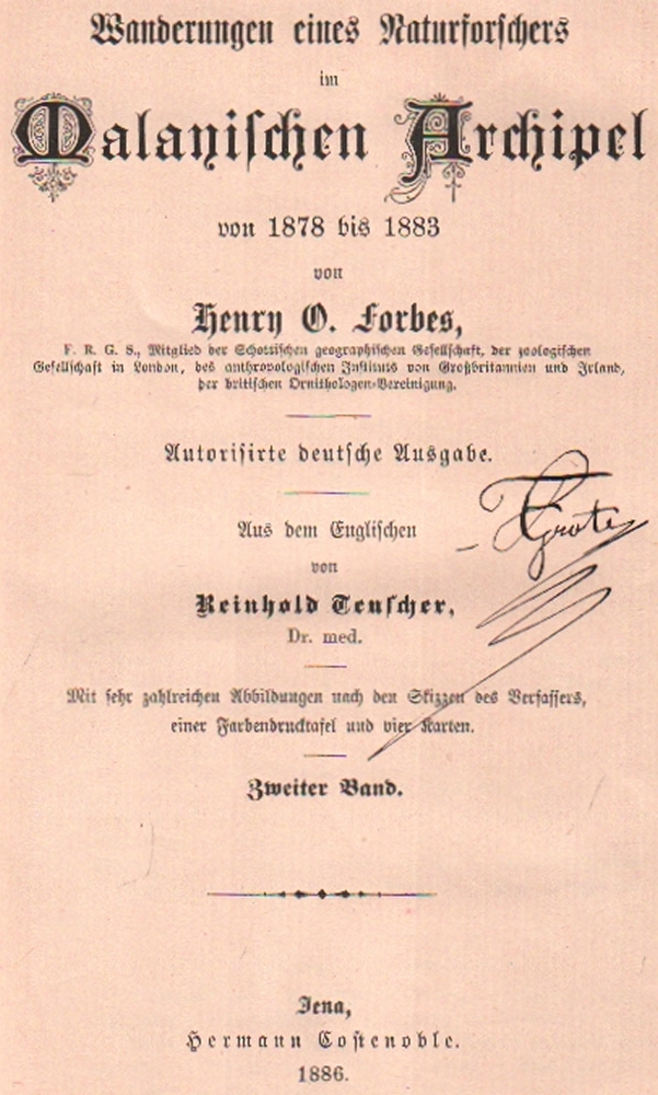 169 Asien.Malaysia. Forbes, Henry O. Wanderungen eines Naturforschers im Malayischen Archipel von 1878 bis 1883. Aus dem englischen von Reinhold Teuscher. 2 Bände. Jena, Costenoble, 1886. 8°. Mit farbigem Frontispiz, 22 Tafeln, vielen Textabb. und 4 gefalteten Karten. Orig. rote Leinenbände mit Schwarzverzierung und goldgeprägtem Titel auf den Vorderdeckeln und Rücken. (12)