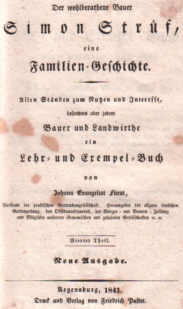 172 Bayern. Fürst. Johann Evangelist. Der wohlberathene Bauer Simon Strüf, eine Familien - Geschichte. Allen Ständen zum Nutzen und Interesse, bes. aber jedem Bauer und Landwirthe ein Lehr –und Exempel-Buch. - J. E. Fürst's Lehr- und Exempel-Buch, worin sonnenklar gezeigt wird, wie der Ertrag des geringsten Gutes in kurzer Zeit außerordentlich erhöht werden kann, wenn die Haus-, Feld- und Garten Wirtschaft, etc. etc. nach den besten praktischen neuern Verbesserungs- Erfahrungen betrieben werden. Mit mehreren andern, sehr nützlichen und einträglichen Neben- Hülfs– Mitteln. 4 Teile in 3 Bänden. Augsburg, Kollmann, & Regensburg, Pustet, 1841. 8°. Mit 3 Titelvignetten und einigen Textabb. Private Halblederbände mit grünem goldgeprägten Rückenschild. (12)