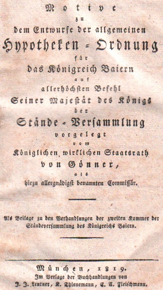 173 Bayern. Gönner, von. Motive zu dem Entwurf der allgemeinen Hypotheken – Ordnung für das Königreich Baiern auf allerhöchsten Befehl Deiner Majestät des Königs, der Stände – Versammlung vorgelegt vom Königlichen wirklichen Staatsrat von Gönner. Als Beilage zu den Verhandlungen der zweiten Kammer der Ständeversammlung des Königreichs Baiern. München, Leutner, Thiemann, Fleischmann. 1819. 8°. 160 Seiten. Brauner Halblederband mit goldgeprägtem und rotem Rückenschild. (12)