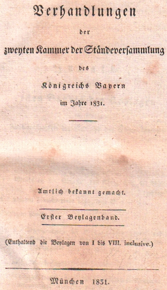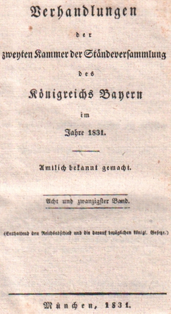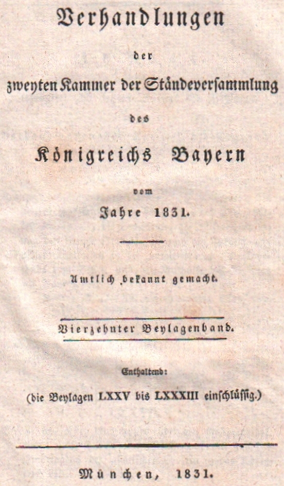 178 Bayern. Ständeversammlung. Verhandlungen der zweiten Kammer der Ständeversammlung des Königreichs Bayern im Jahre 1831. Amtlich bekannt gemacht. Band 1 – 28 letzter Band, den “Reichsabschied“ und die darauf bezüglich königl. Gesetze. Enthaltend sind die Protokolle einschl. der öffentlichen Sitzungen. Beiliegen die Beilagenbände: Band 1 – 14 in 15 Bänden (Bd. 10 in 2 Bde.) Schlichte blaue Pappbände mit gedruckten roten Rückenschildern. (12)