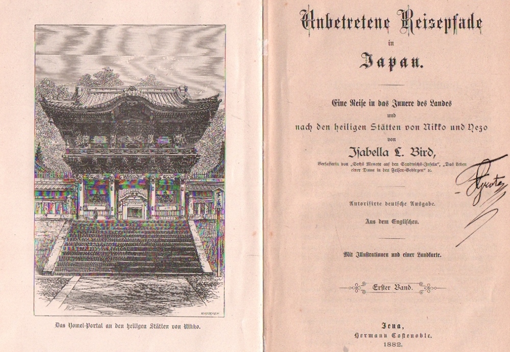 182 Japan. Bird, Isabella L. Unbetretene Reisepfade in Japan. Eine Reise in das Innere des Landes und nach den heiligen Stätten von Nikko und Yezo. Autorisierte deutsche Ausgabe. Aus dem Englischen. 2 Bände in 1 Band. Jena, Costenoble 1882. 8°. Mit 2 Frontispizen und vielen Textabb. und einer getönten und gefalteten Karte. XI, 299; VII, 235 S. Orig. illustrierter grüner Leinenband mit goldgeprägtem Titeldruck auf Vorderdeckel und Rücken. (12)