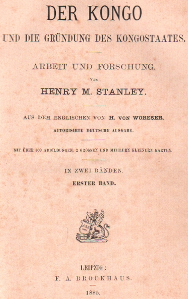 190 Afrika. Kongo. Stanley, Henry M. Der Kongo und die Gründung des Kongostaates. Arbeit und Forschung. 2 Bände. Aus dem Englischen von H. v. Wobeser. Leipzig, Brockhaus, 1885. 4°. Mit 2 Porträts, 41 Tafeln, vielen Textabb. und nur 4 (statt 5) farbigen gefalteten Karten (1 (statt 2) große lose davon im 2. Band). XXXVIII, 557 S.; XII, 516 Seiten. Originale braune Halblederbände mit goldgeprägtem Rückentitel und leichter Rückenvergoldung. (72)