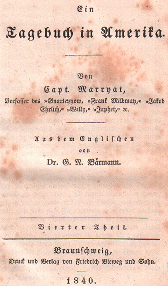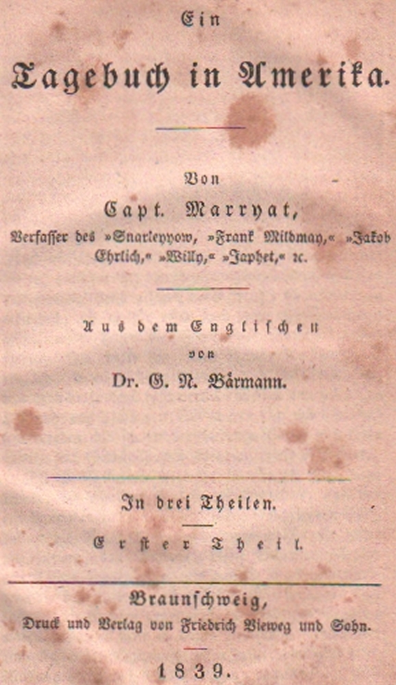 192 Amerika. Marryat, Capt. Ein Tagebuch in Amerika. 6 Teile in 2 Bänden (alles erschienene). Aus dem Englischen von G. R. Bärmann. Braunschweig, Vieweg, 1839 - 1840. Klein 8°. Halblederbände der Zeit mit reicher Rückenvergoldung und goldgeprägtem Rücktitel. (72)