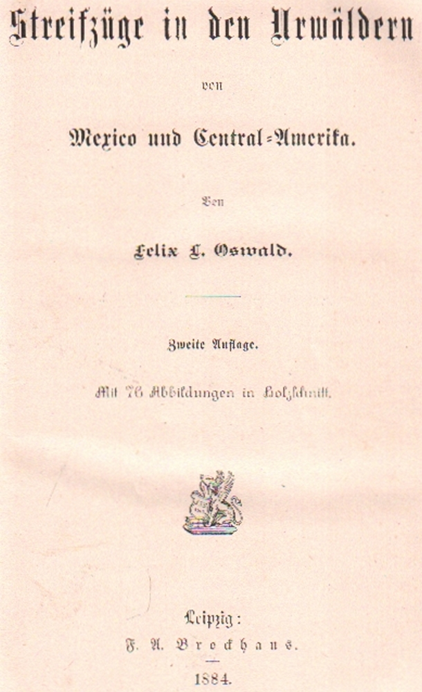 193 Amerika. Oswald, Felix L. Streifzüge in den Urwäldern von Mexico und Central-Amerika. Leipzig, Brockhaus, 1884. 4°. Mit Frontispiz und 76 Textholzschnitten. XXIV, 384 Seiten. Orig. grüner Leinenband mit goldgeprägter Abbildung auf dem Vorderdeckel und Rückentitel. (72)