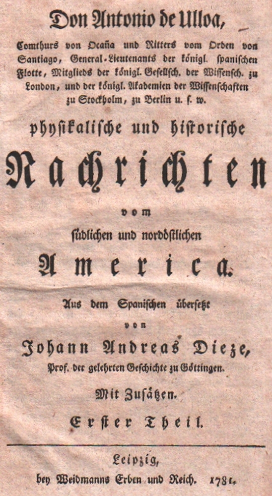 195 Amerika. Südamerika und Mittelamerika. Ulloa, Antonio de. Physikalische und historische Nachrichten vom südlichen und nordöstlichen America. 2 Bände. Aus dem Spanischen übersetzt von Joh. Andreas Dieze. Mit Zusätzen. Leipzig, Weidmanns Erben & Reich, 1781. 8°. Zwei Lederbände der Zeit mit Rückenschildchen und Rückenvergoldung. (72)