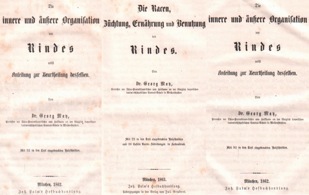 258 Rinderzucht. May, Georg. Das Rind. Seine innere und äußere Organisation, Züchtung, Ernährung und Benutzung, sowie dessen Krankheiten. 2 Bände. München, Palm & Grubert, 1862 / 1863. 4°. Mit Textabb. und zus. 20 farbige Tafeln. Ausgeblichene Halbleinenbände. (12)