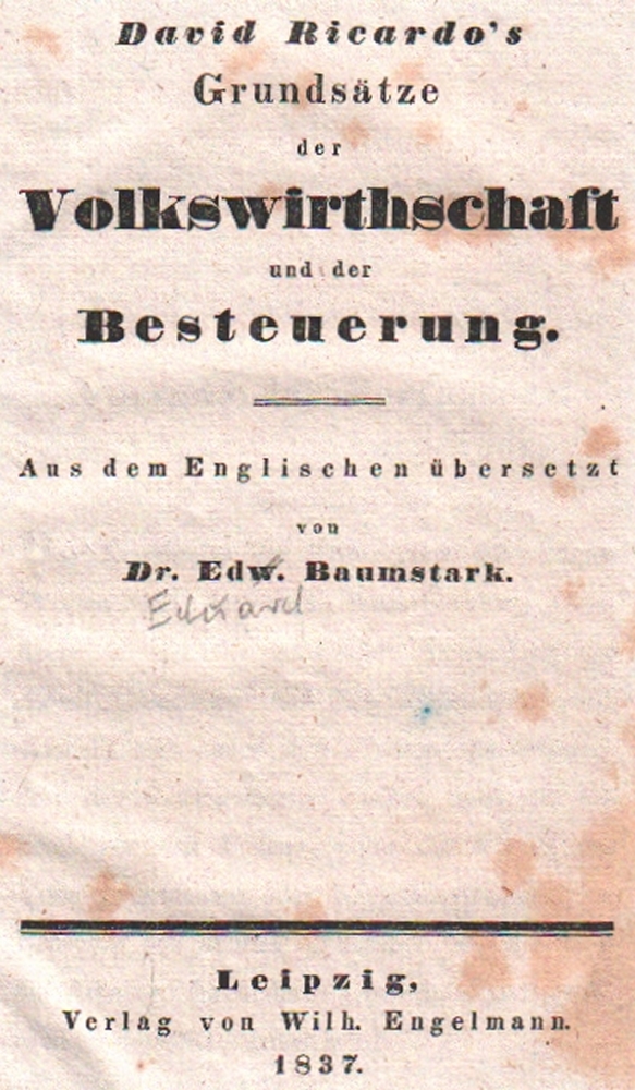 262 Volkswirtschaft. Ricardo, David. Grundsätze der Volkswirtschaft und der Besteuerung. Erster Teil. Aus dem Englischen übersetzt und erläutert, von Ed. Baumstark. Leipzig, Engelmann, 1837. 8°. XXXII, 461 S. 1 Bl. Verlagsanzeige. Schlichter Pappband mit goldgeprägtem Rückenschild. (12)