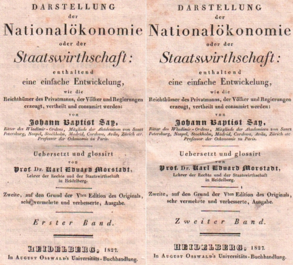 263 Volkswirtschaft. Say, Jean - Baptist. Darstellung der Nationalökonomie oder der Staatswirtschaft: enthaltend eine einfache Entwicklung wie die Reichthümer des Privatmanns, der Völker und Regierungen erzeugt, vertheilt und konsumiert werden. Übersetzt und glossiert von Karl Eduard Morstadt. Zweite, auf den Grund der V. Edition des Originals sehr vermehrte und verbesserte Ausgabe. 3 Bände in 2 gebunden. Heidelberg, Oswald,1827. 8°. Mit 1 gefalteten Tabelle. XIV, 563 S.; Titel, 240; 555 S. 1 Bl. Verbesserungen. Halblederbände d. Zt. mit leichter Rückenvergoldung und 2 farbigen goldgeprägten Rückenschildern. (12)