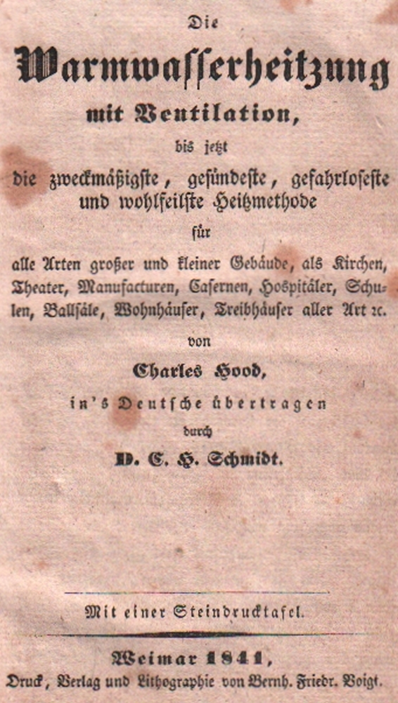 264 Warmwasserheizung. Hood. Charles. Die Warmwasserheizung mit Ventilation, bis jetzt die zweckmäßigste, gesündeste, gefahrloseste und wohlfeilste Heizmethode für alle Arten … ins Deutsche übertragen von E. H. Schmidt. Weimar, Voigt, 1841. 8°. Mit 2 gefalteten Steindrucktafel. XII, 240 Seiten. Privater Halblederband mit grünem Rückenschild. (12)