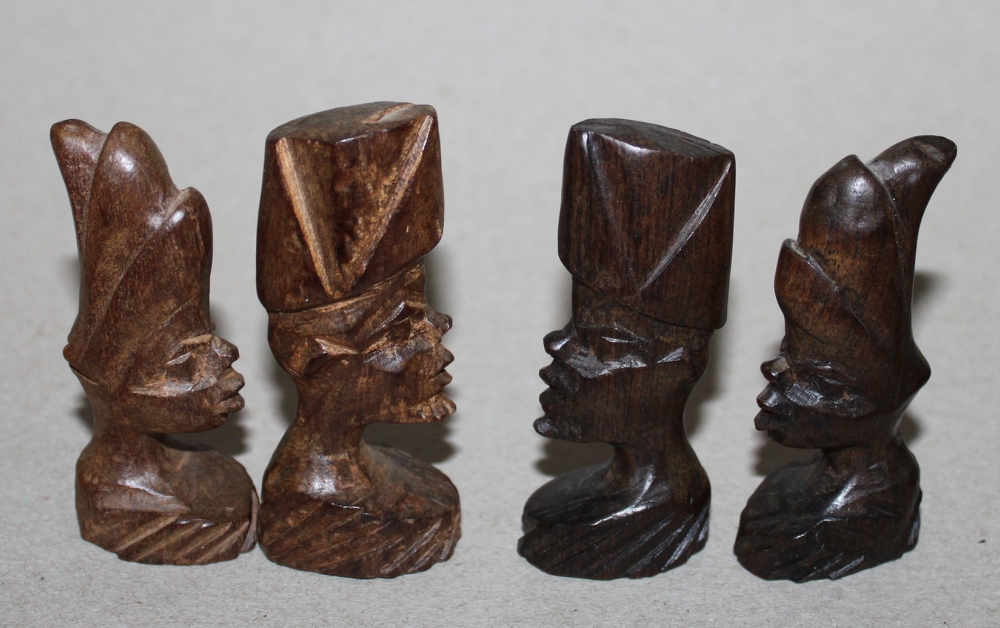 huts. Enclosed with a small African chess set made of wood. One side stained in