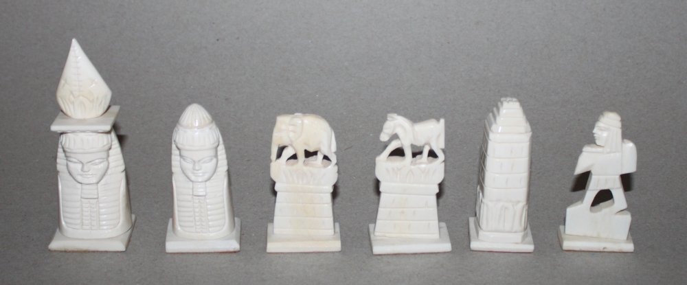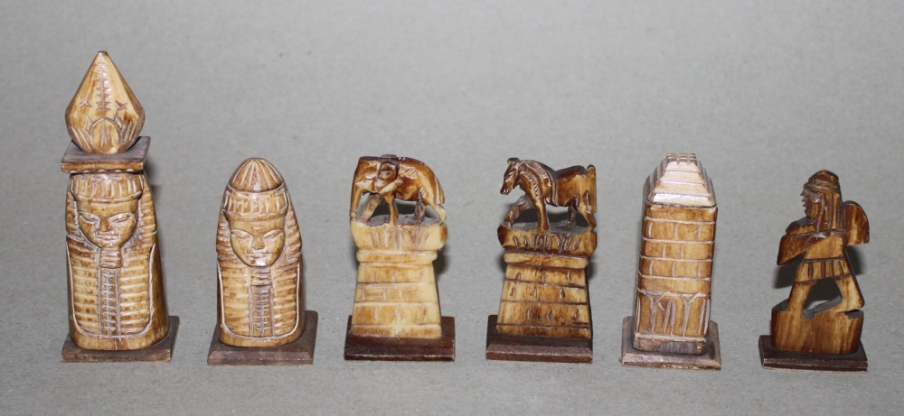 #270 Afrika. Ägypten. Schachfiguren aus Bein - Figuren nach Motiven aus dem alten Ägypten im historischen Stil. Beide Parteien sind gleich, eine Partei in hellbraun, die andere naturfarben. Produktion aus der zweiten Hälfte des 20. Jhrdts. Höhe König 10,6 cm; Bauer 7,2 cm. (26)