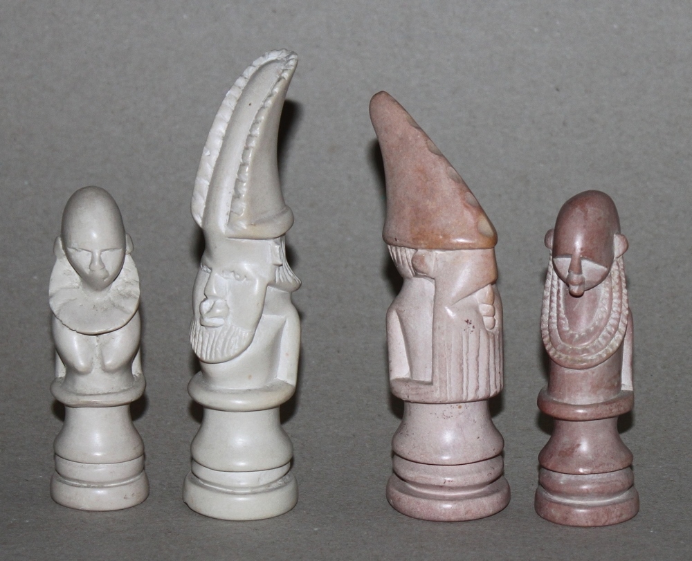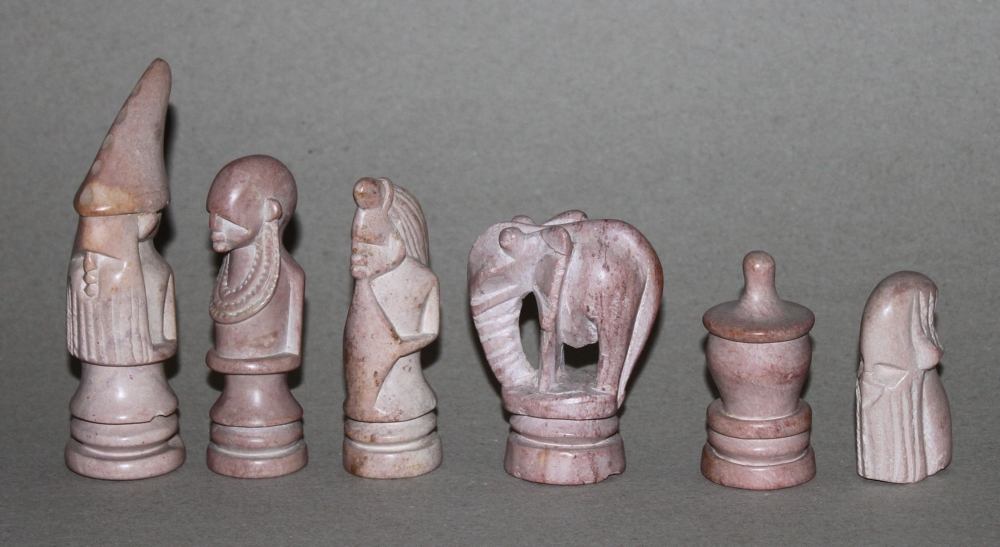 #272 Afrika. Kenia. Schachfiguren aus Speckstein. Eine Partei in hellrot, die andere in naturfarben (Hellgrau) Afrika, Produktion aus den 1990er Jahren. Höhe König 12,1 cm; Bauer 6 cm. (19)