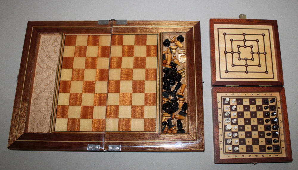 Morocco. Miniature travel chess set, wooden box with a chessboard inside. One side in black, the other is white. Produced in Morocco, second part of the 20th century.