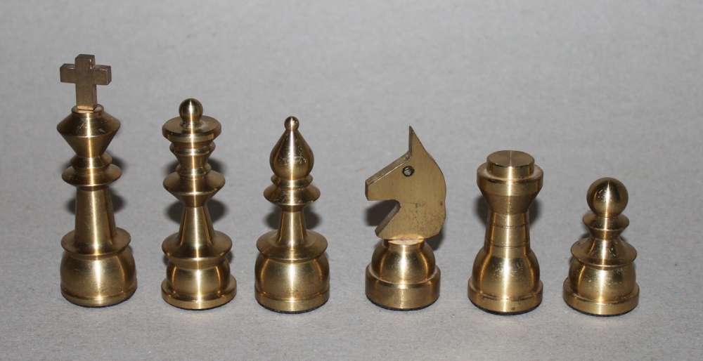 #274 Afrika. Nigeria. Schachfiguren aus Metall (Messing). Volkskundliche Metallfiguren im afrikanischen Stil, unterschiedlich patiniert, eine Partei in hell, die andere in dunkel. Nigeria, um 1980. Größe Spielfiguren: König 6,5 cm; Bauer 5,5 cm. (24)
