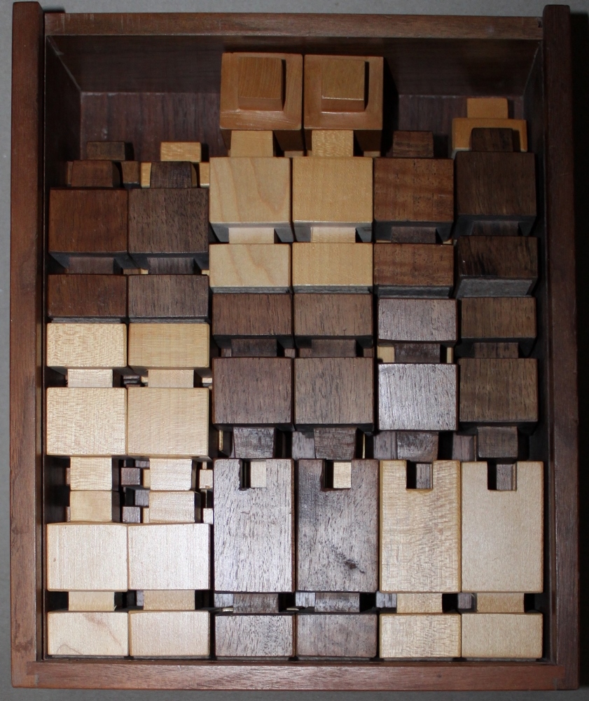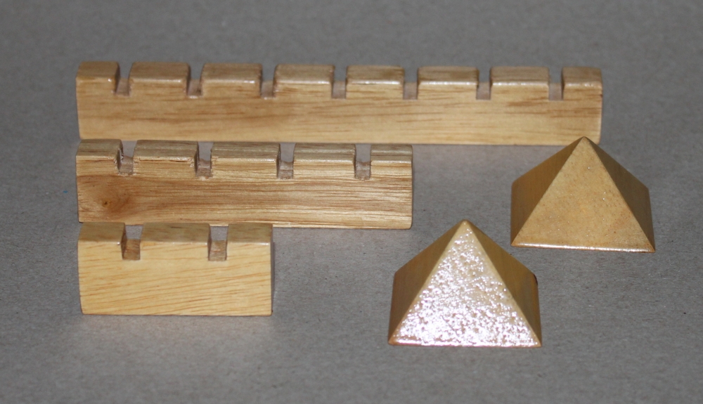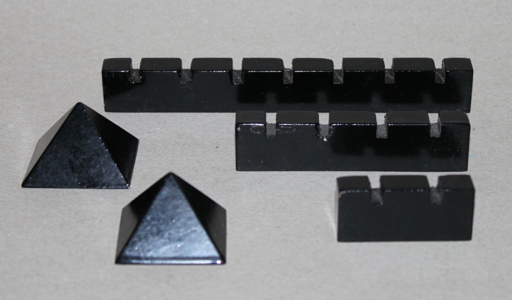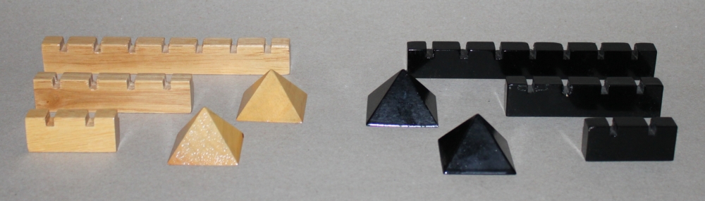 Set with a total of 16 pieces. This variation contains 4 pyramids (2 black and 2 natural), 4 small