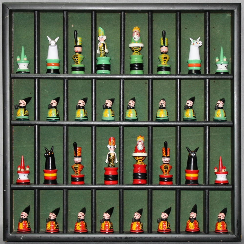 #333 Europa. Tschechien. Folkloristisches Schachspiel aus Holz. Eine Partei in rot , die andere in grün. Produktion aus der 2. Hälfte des 20. Jhrdts. . Höhe König 8,5 cm; Bauer 4,5 cm. (19)