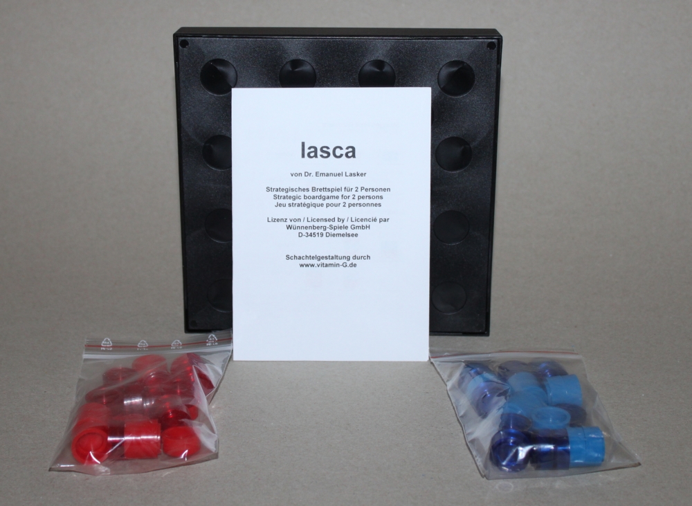 #335 Spiele. Laska von Emanuel Lasker. Spiel mit 48 runden Spielsteinen aus Kunststoff, 1 Spielbrett auf der Unterseite des Kunststoffbehälters und 1 gefalteten Blatt Spielanleitung. Dortmund, toytoytoy, ca. 2000. Durchmesser Spielstein: 1,9 cm, Höhe 1,0 cm; Größe Brett: 17 x 17 cm. In transparenter flexibler Kunststoffhülle. (79)