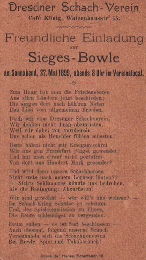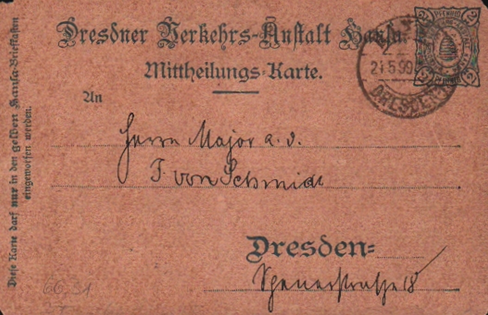 #337 Dresdner Schach – Verein. Gedruckte Einladung zur Sieges - Bowle am 27. Mai 1899 auf einer Mitteilungs – Karte der Dresdner Verkehrs – Anstalt Hansa mit gedruckter Marke, Stempel vom 21.5.(18)99 und handschriftlicher Adresse. Größe 14,3 x 9 cm. (66)