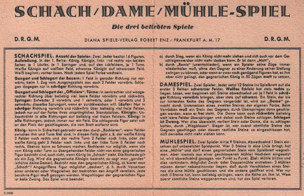 Interessante Memorabilie. Beiliegen: Taschenschachspiel für Soldaten. Schach / Dame / Mühle – Spiel.