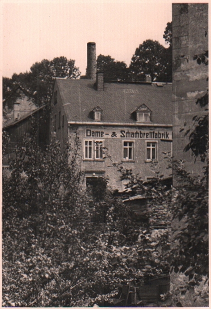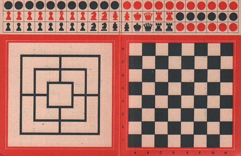 Klappkarte aus Karton mit Spielbrett für Schach / Dame und Spielbrett für Mühle,