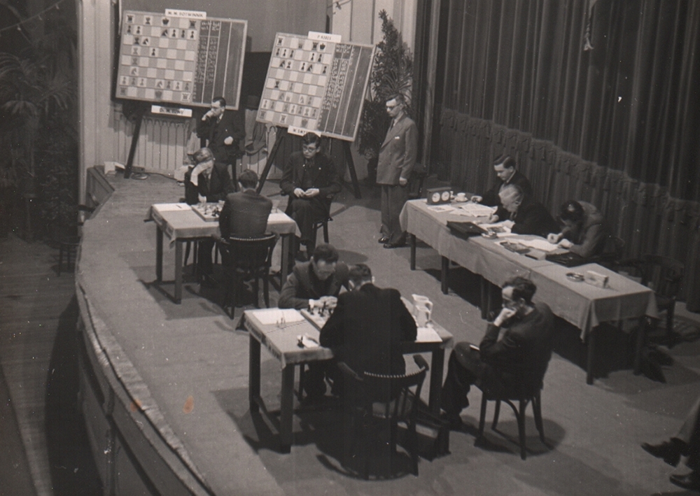 die Bühne mit dem Wettkampfgeschehen. An zwei Tischen sitzen Michail Botwinnik