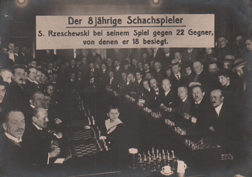 #345 Foto. Reshevsky, Samuel. Schwarzweißes Pressefoto des 8jährigen Samuel Reshevsky bei einer Simultanveranstaltung, ca. 1919. Größe 17,3 x 12,4 cm. (66)