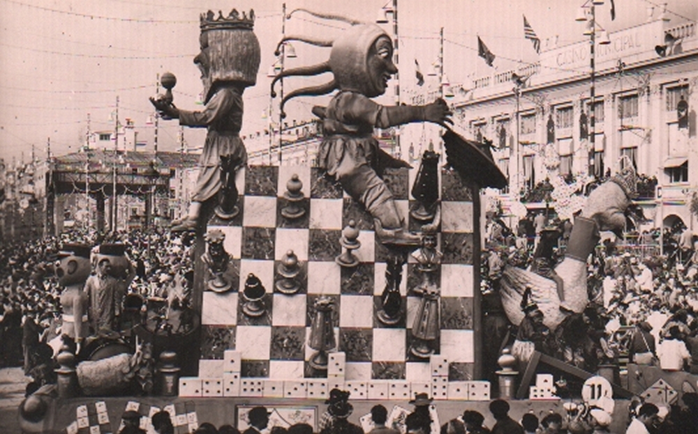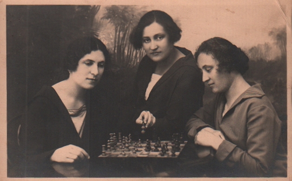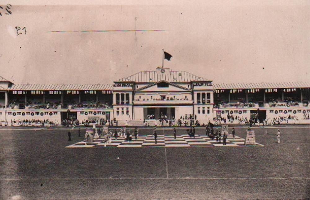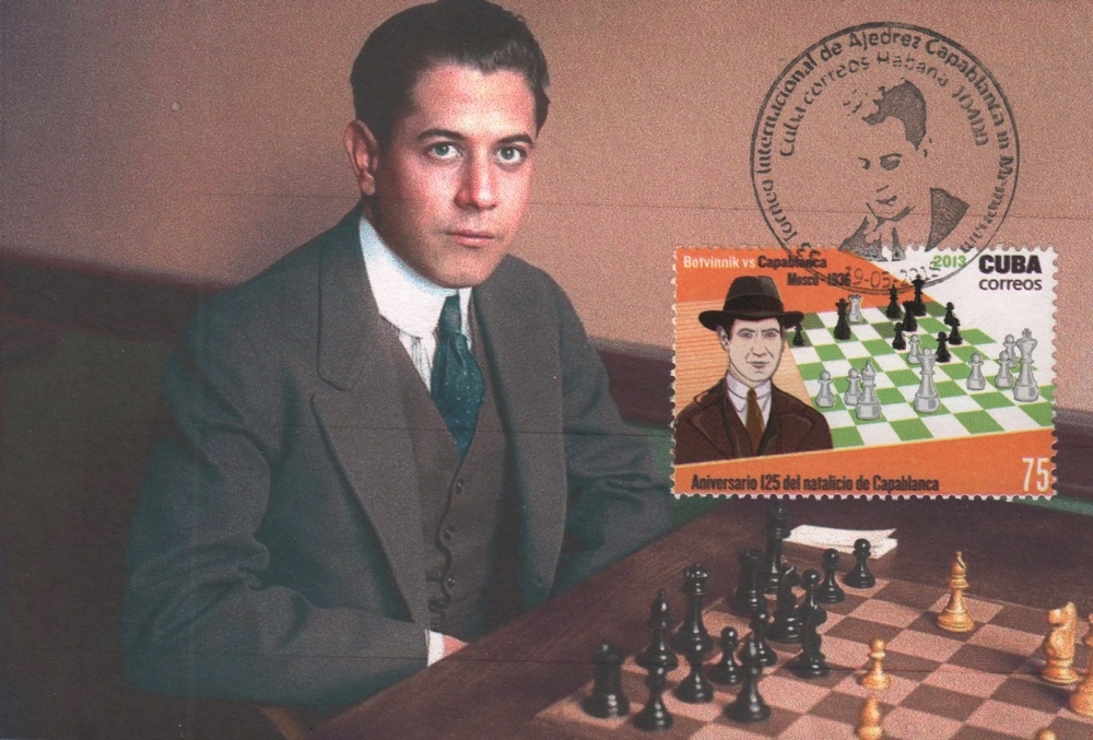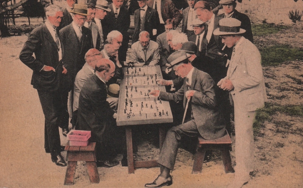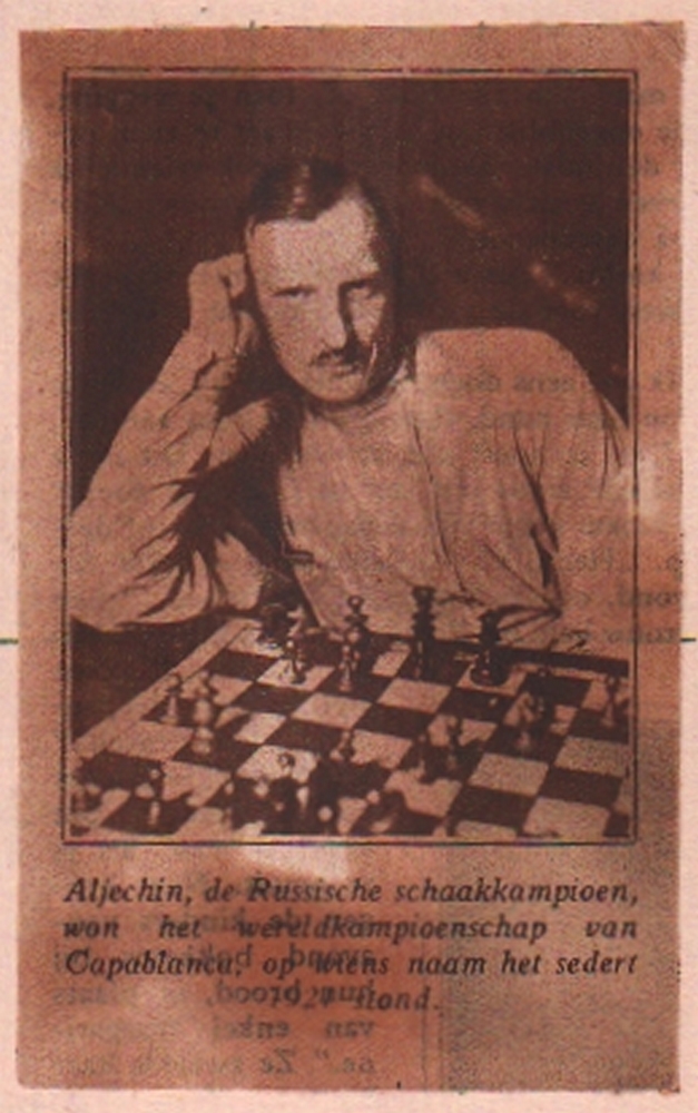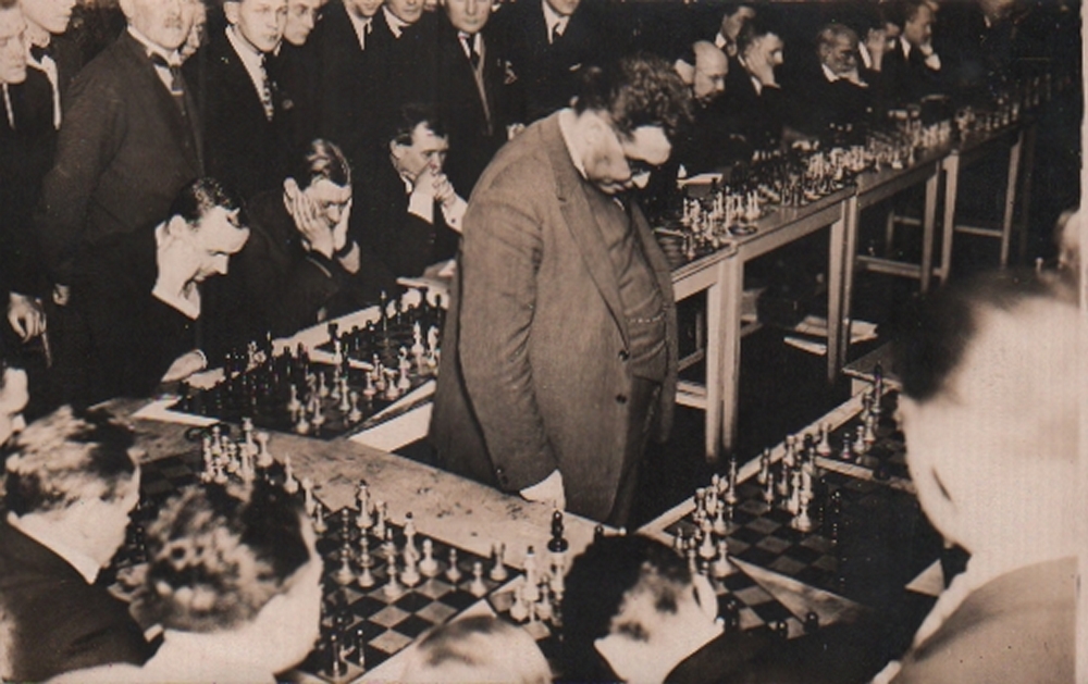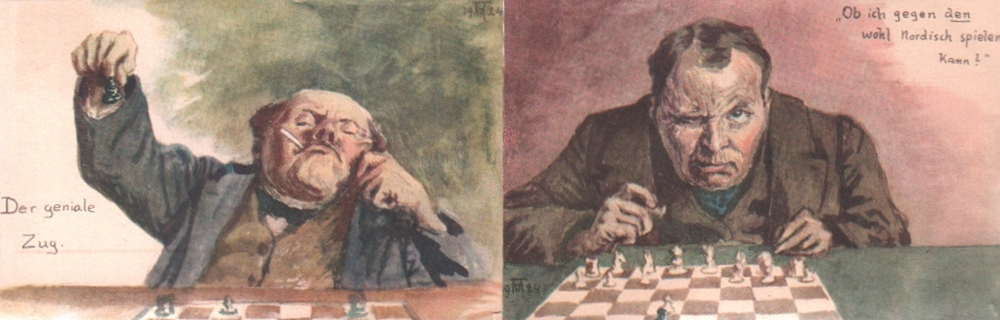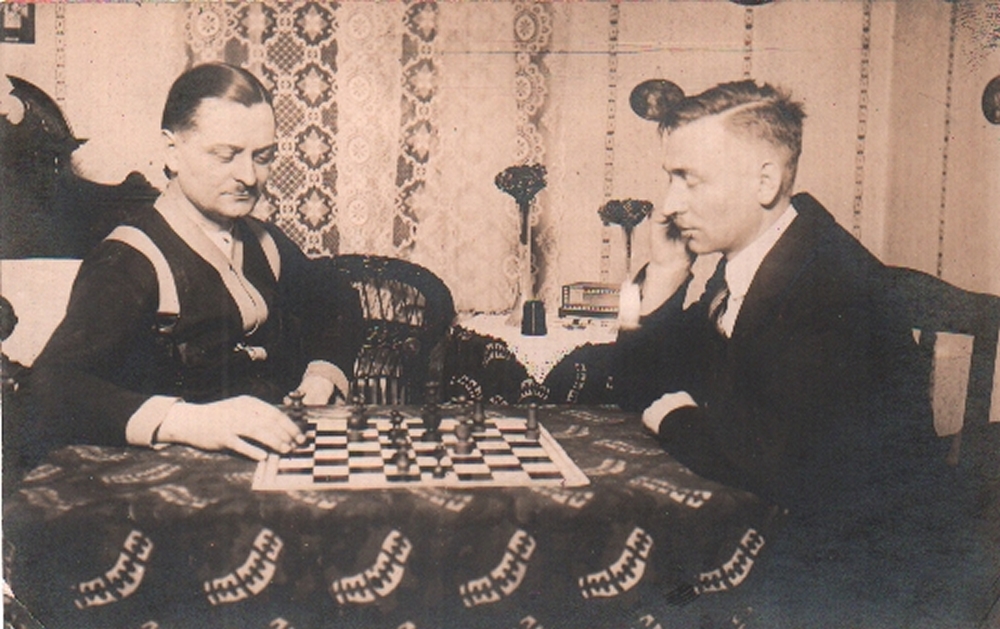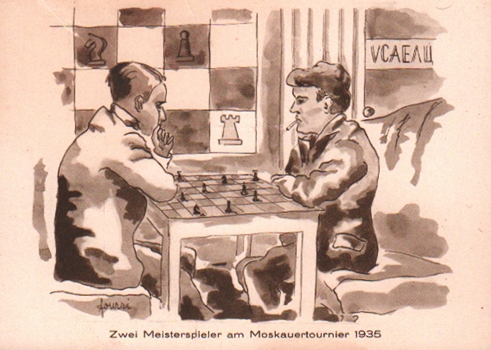 einer Schachpartie. Dahinter stehen Alexander Aljechin, José Raoul Capablanca