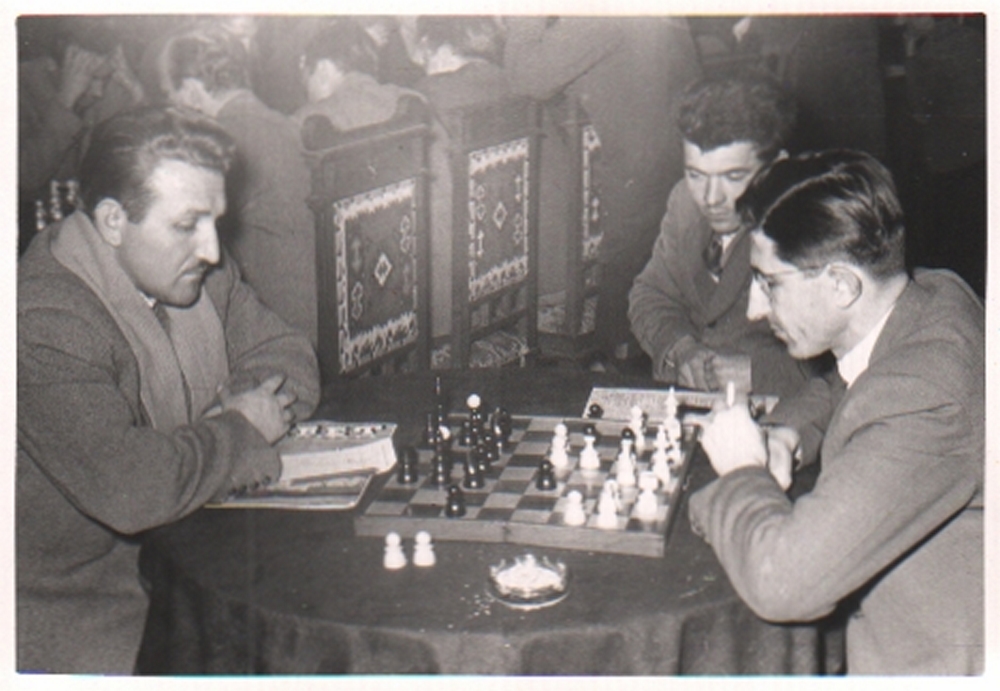 Smyslow und Keres bei einer Wettkampfpartie, die beide auf das Spielbrett