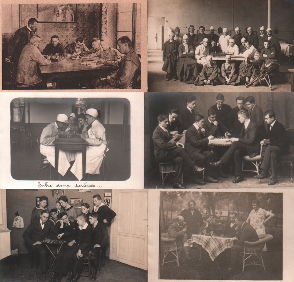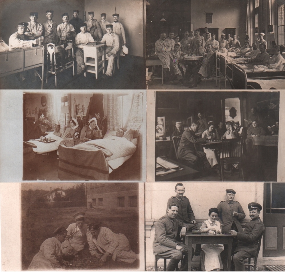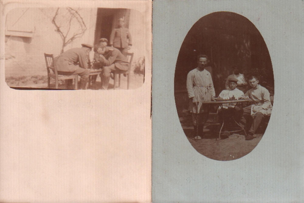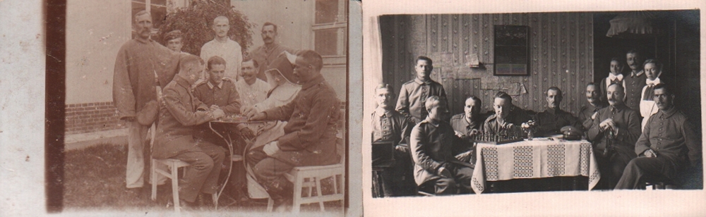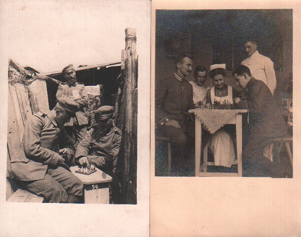 #471 Postkarte. Soldaten und Sanitätspersonal beim Schachspiel. 12 schwarzweiße und teilweise postalisch gelaufene Postkarten aus den 1910er und 1920er Jahren. Größe jeweils ca. 14 x 9 cm. (40)