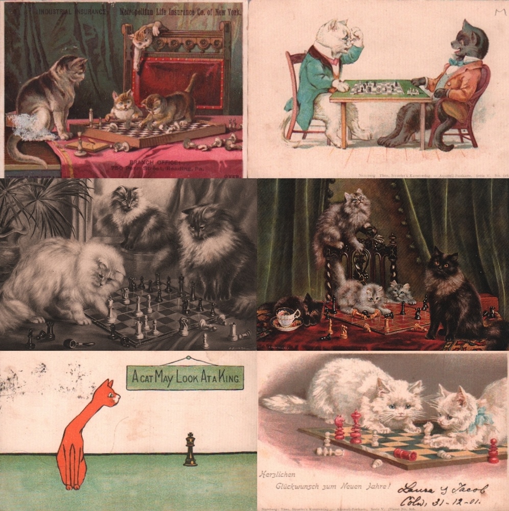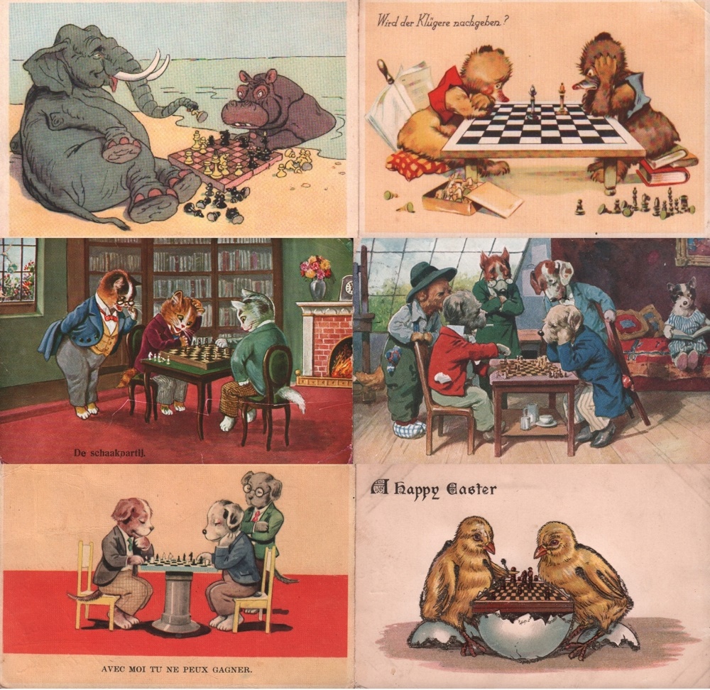 #475 Postkarte. Tiere beim Schachspiel. 12, teils farbige und teils postalisch gelaufene Postkarten aus dem 20. Jahrhundert. Größe jeweils ca. 14 x 9 cm. (40)