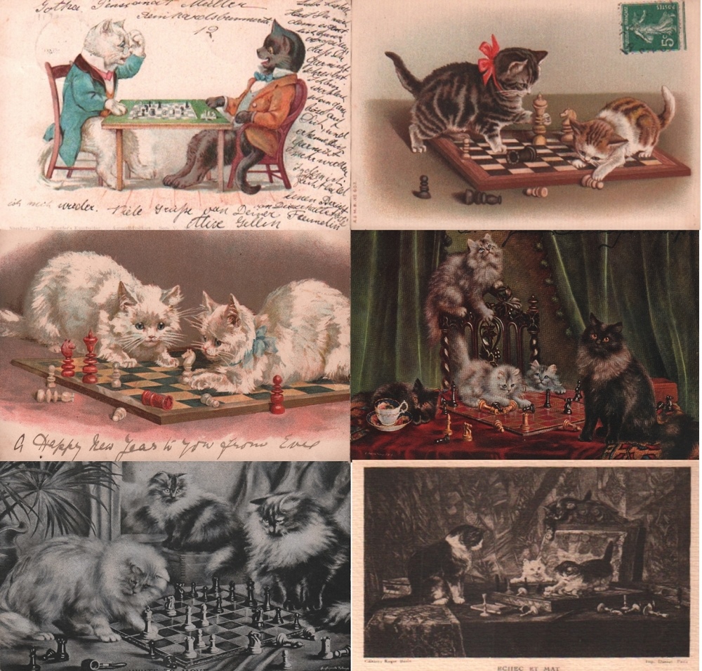 * Die Karten zeigen meist humoristische Szenen von Tieren beim Schachspiel.