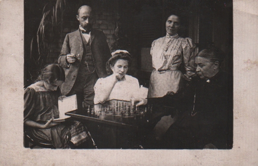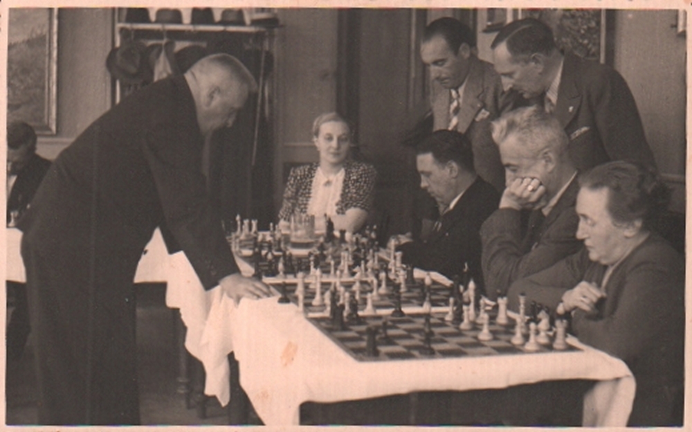 Schachpublizisten und –mäzen Bernhard Kagan. Im Hintergrund sind weitere