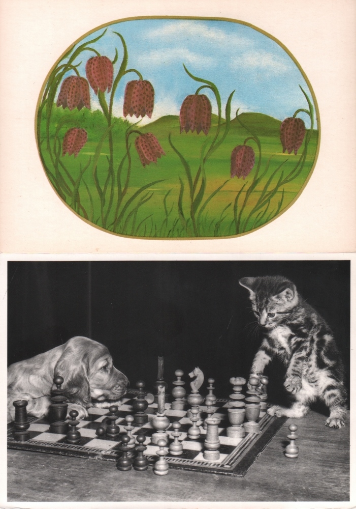 #476 Postkarte. Tiere beim Schachspiel und Schachbrettblume. Konvolut von 140, meist farbigen und teils postalisch gelaufenen Postkarten aus dem Ende des 20. Jahrhunderts. Größe jeweils ca. 15 x 10,5 cm. (40)