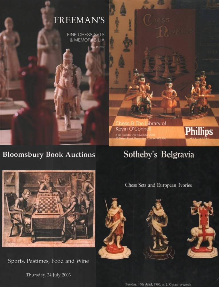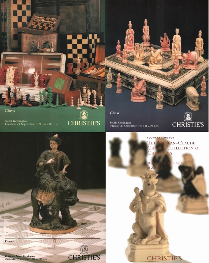 751 Christie's. Konvolut von 4 Auktionskatalogen des Auktionshauses Christie's aus den Jahren 1993 - 2007, meist mit einem Angebot von Schachfiguren und Schachbrettern. London 1993 - 2007. 4°. Mit vielen, teils farbigen Textabbildungen. Orig. geheftet. (79)