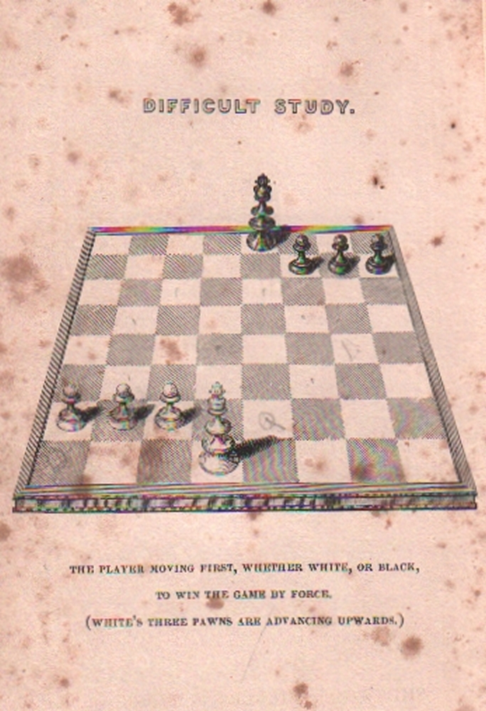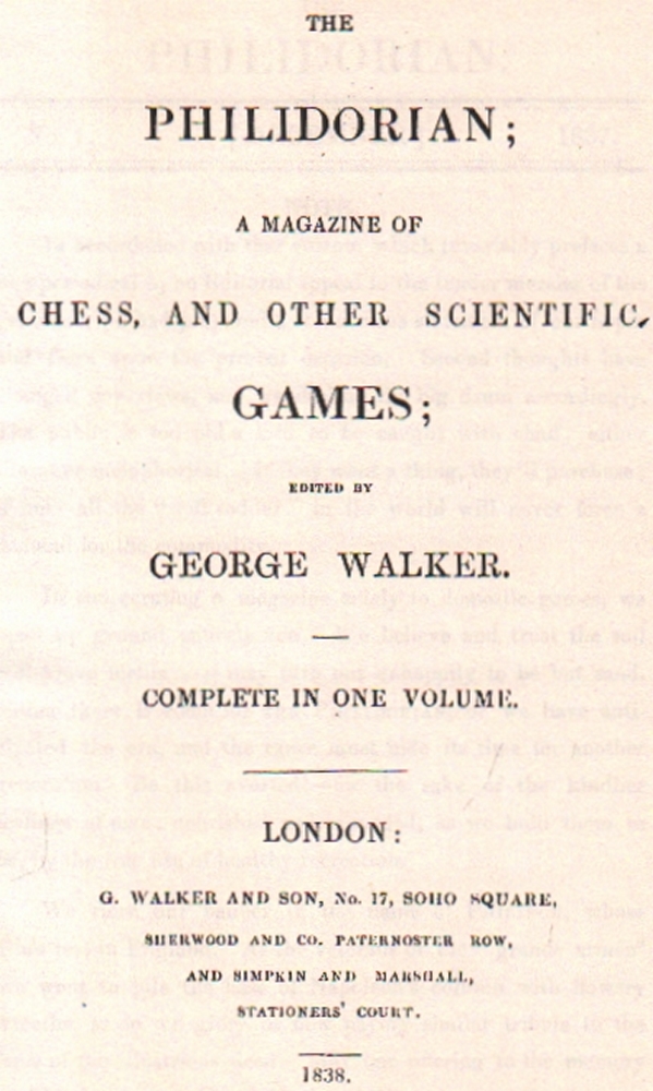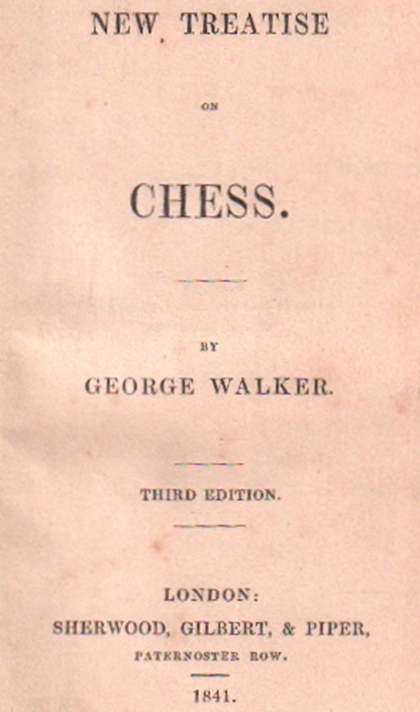 774 Walker, George. A new treatise on chess. 3rd edition. London, Sherwood, Gilbert & Piper, 1841. 8°. Mit 1 Frontispiz (Diagramm) und 1 Diagramm im Text. XVI, 296 Seiten, 24 Seiten Anzeigen. Blindgeprägter Leinenband mit goldgeprägtem Rückentitel. (Als aufgeschnittene Broschur gebunden) (79)
