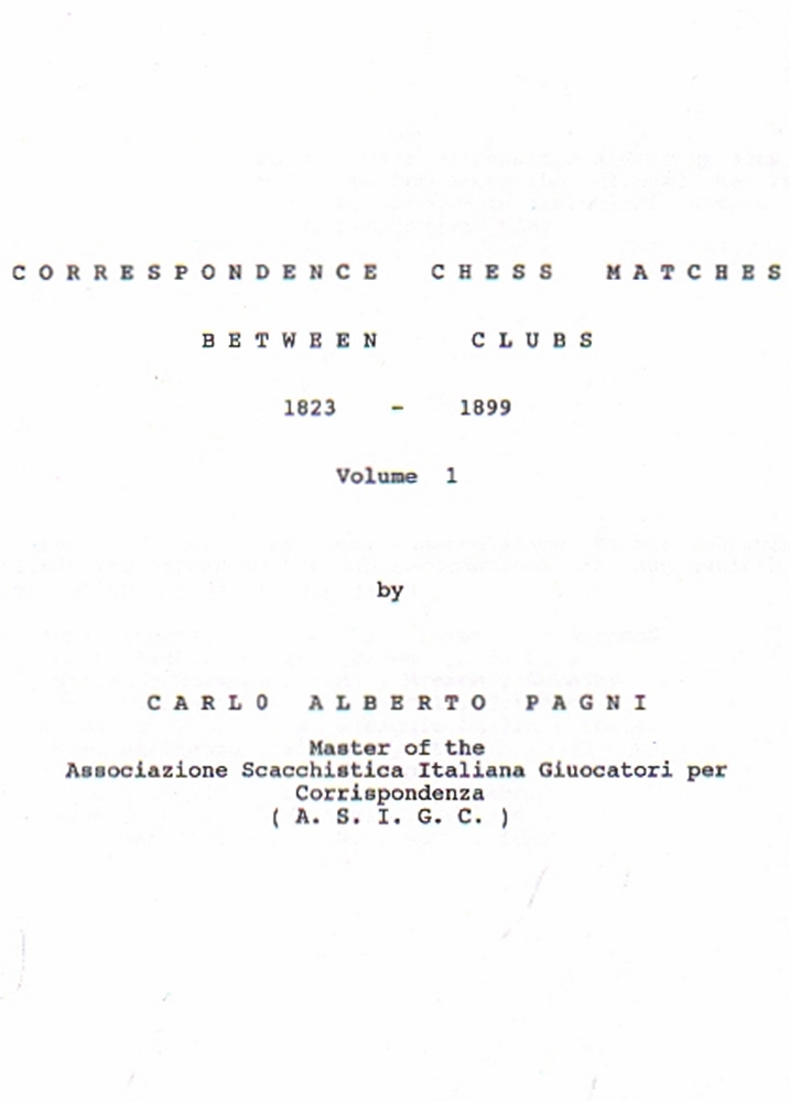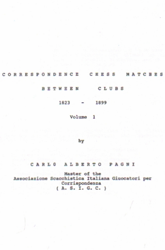766 Pagni, C. A. Correspondence chess matches between clubs 1823 - 1899. Vol. 1 (von 4). Turin, (1994). 8°. Mit Textabb. und Diagr. 1 Bl., VIII, 189 Seiten. Orig. geheftet. (19)