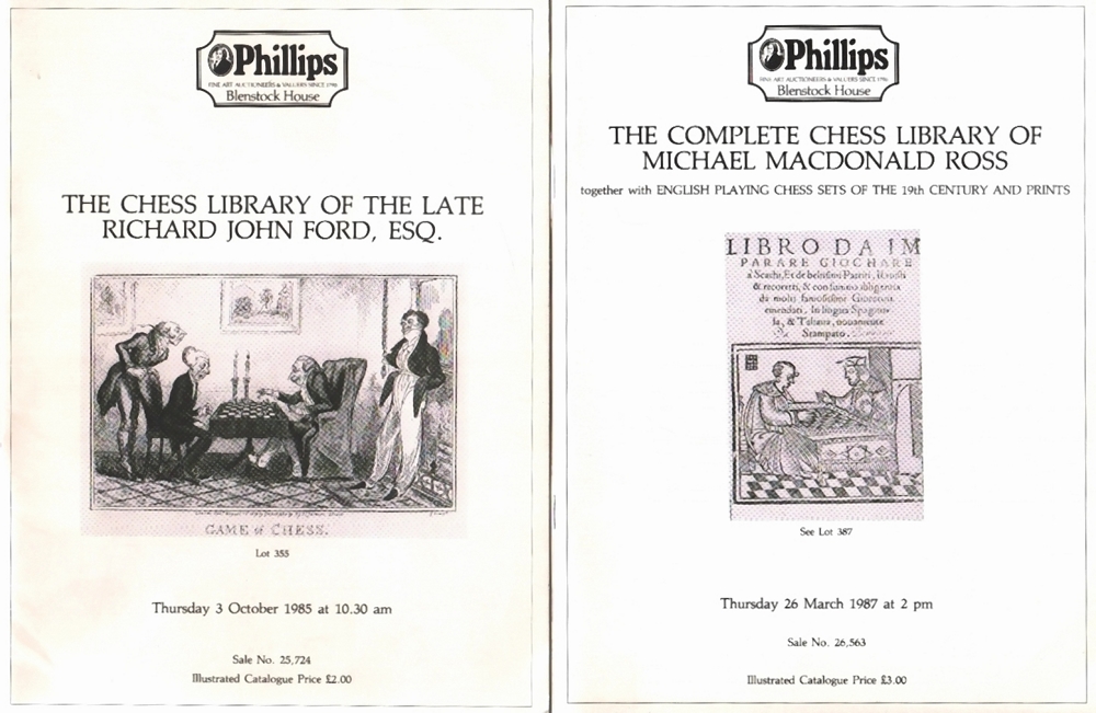 767 Phillips. Konvolut von 7 Auktionskatalogen des Auktionshauses Phillips aus den Jahren 1985 - 1998, meist mit einem Angebot von Schachfiguren und Schachbrettern. London 1985 - 1998. 4° und 8°. Mit Textabb. Orig. geheftet. (79)