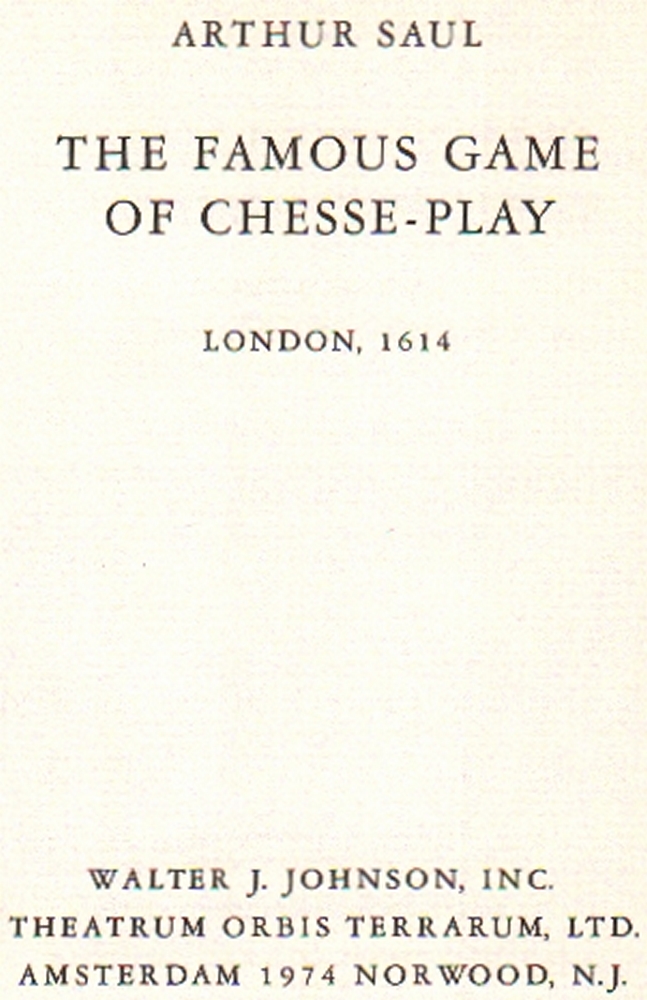 771 Saul, Arthur. The famous game of Chesse - play. London, 1614. Nachdruck. Amsterdam, Theatrum Orbis Terrarum u. Norwood, Johnson, 1974. 12°. Mit 3 wiederholten Textabb. 30 unn. Bll. Leinenband. (79)