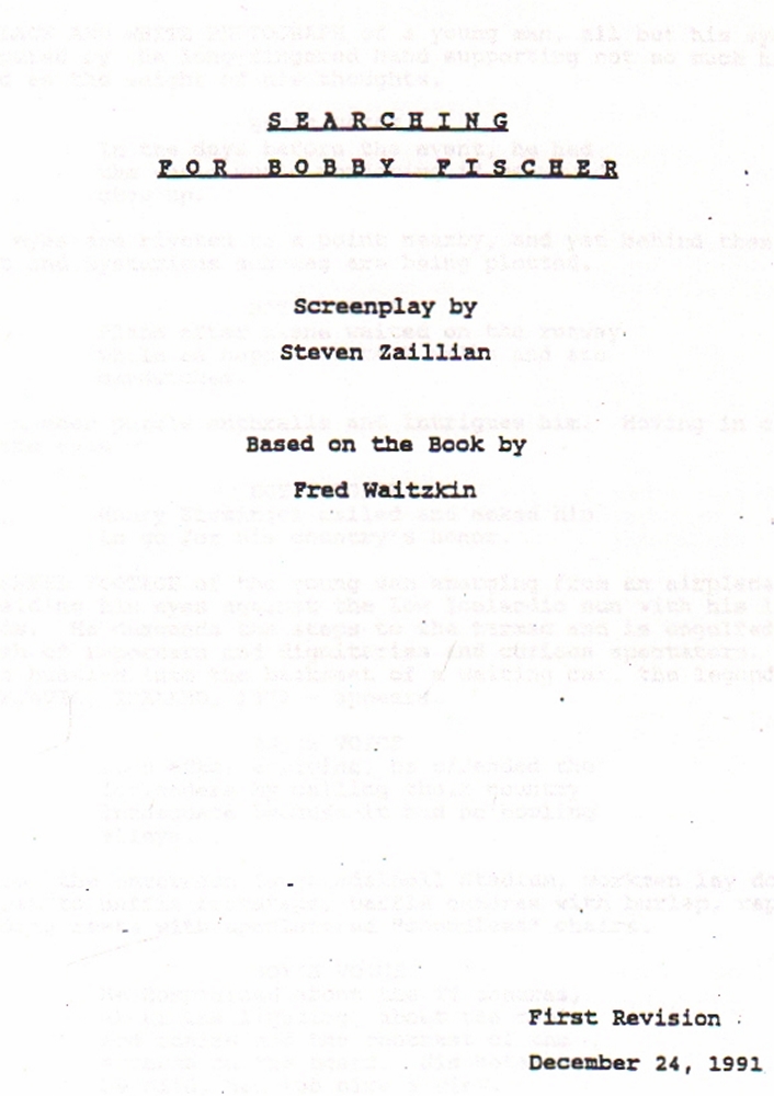775 Zaillian, Steven. Searching for Bobby Fischer. Screenplay by Steven Zaillian. Based on the Book by Fred Waitzkin. First Revision December 24, 1991. 4°. 129 Bll. Gehefet. (Umschlag mit Gebrauchsspuren) (19) € 30,00