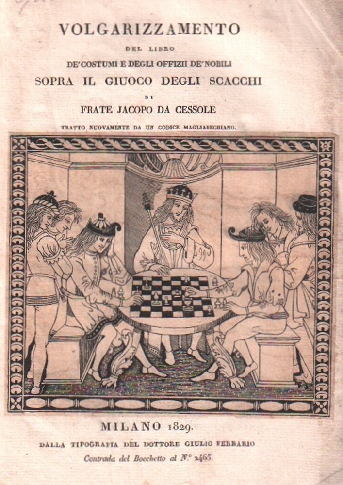 787 Cessolis, Jacobus de. Volgarizzamento del libro de'costumi e degli offizii de'nobili sopra il giuoco degli scacchi ... Tratto nuovamente da un codice Magliabechiano. Mailand, Ferrario, 1829. Gr. - 8°. Mit einem großen Titelholzschnitt und 13 montierten Textholzschnitten. XX, 162 Seiten, 1 Bl. Broschiert mit lithographiertem Umschlag. (49)