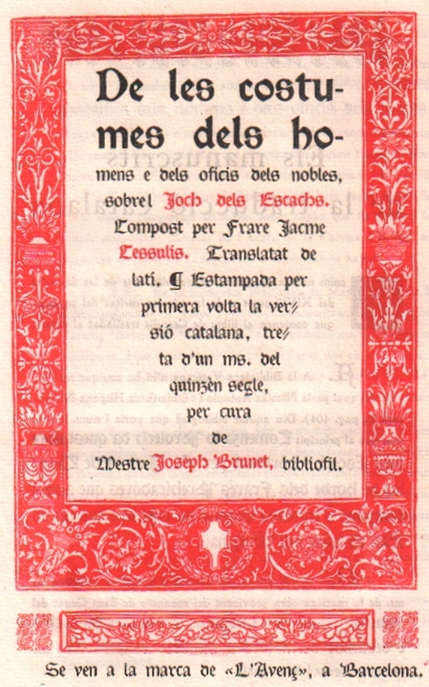 788 Cessolis, Jacobus de. De les costumes dels homens e dels oficis dels nobles, sobrel Joch dels Escachs. Compost per Frare Jacme Cessulis. Translatat de latí. Estampada per primera volta la versió catalana treta d'un ms. del quinzèn segle, per cura de Joseph Brunet. Barcelona, L'Avenç, (1900). 4°. Mit 20 Textabbildungen und einigen farbigen Initialen. 159 Seiten, 2 Bll. Aufgeschnittene Broschur. (79)