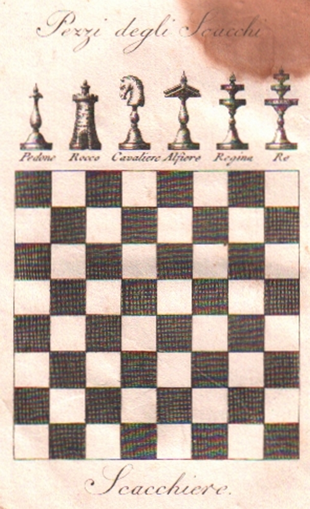 789 (Colombo, Michele = Übersetzer) Il Giuoco degli Scacchi. Trattatello tradotto dall'Inglese aggiuntavi la Biblioteca Ragionata degli scittori del giuoco stesso dell'Abate Francesco Cancellieri. Venedig, Orlandelli, 1824. 8°. Mit Kupferstichfrontispiz. (Schachbrett mit 6 Spielfiguren). 174 Seiten. Aufgeschnittene Broschur im lithograpghierten Umschlag. (49)