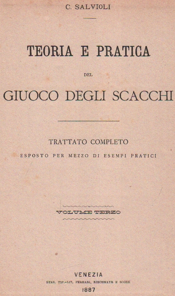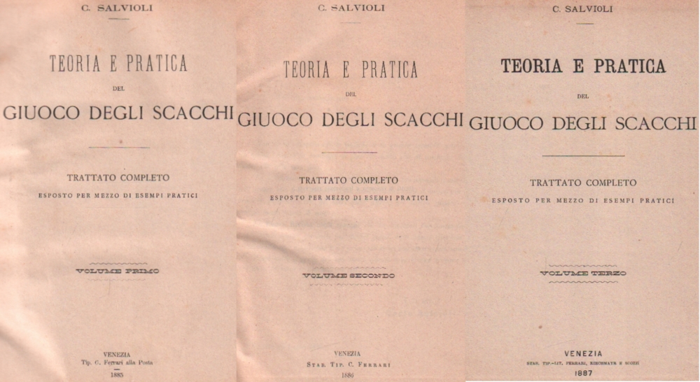 800 Salvioli, Carlo. Teoria e pratica del giuoco degli scacchi. Trattato completo esposto per mezzo di esempi pratici. 3 (von 4) Bänden. Venedig, Ferrari, 1885 - 1887. 8°. Mit vielen Diagrammen. Blaue Halbleinenbände mit goldgeprägtem Titeldruck auf Rücken. (49)