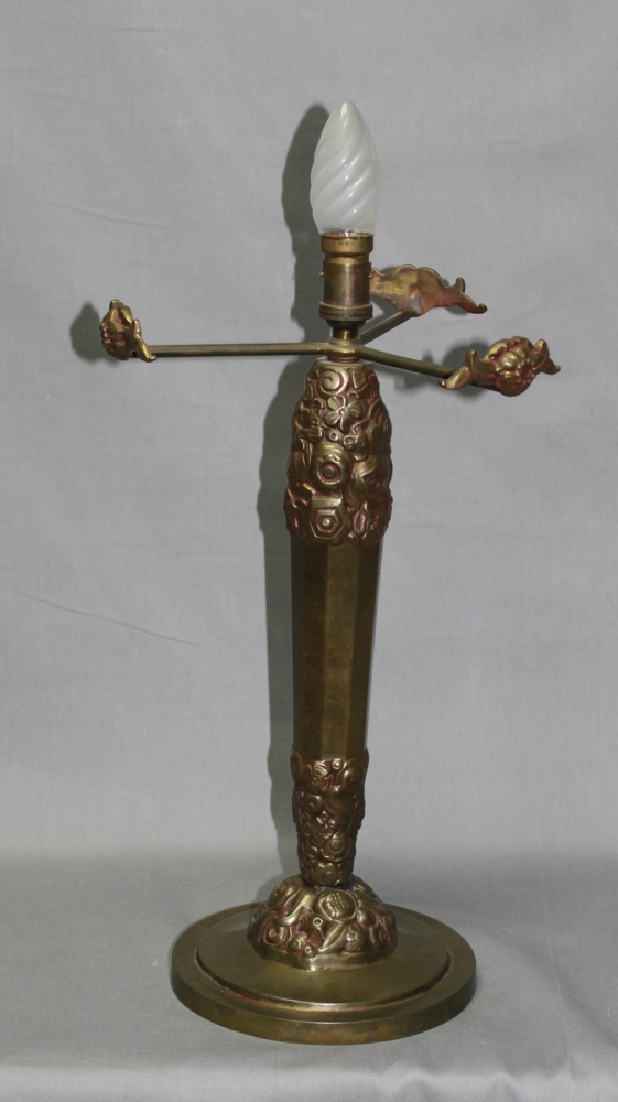 #3 Jugendstil. Tischlampe aus Metall mit kegelförmigen Lampenschirm aus opakem mattiertem Glas mit der blankgeätzten Ätzsignatur “Muller Fres. Luneville“. Einflammig, Lampenfuß und Haltebügel aus dunkel patiniertem Metall mit Dekor. Aus den 1930er Jahren. Lampe Höhe 53 cm. Durchmesser Lampenschirm 22 cm und Höhe 19 cm. (18)