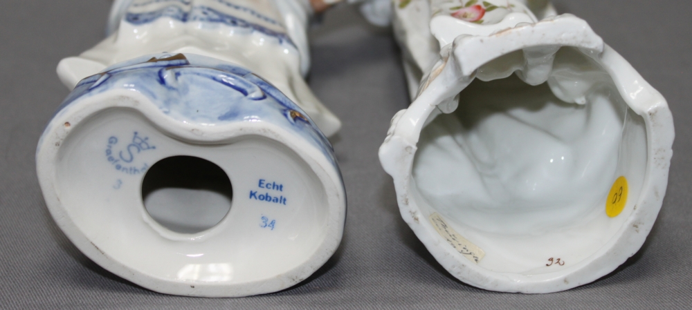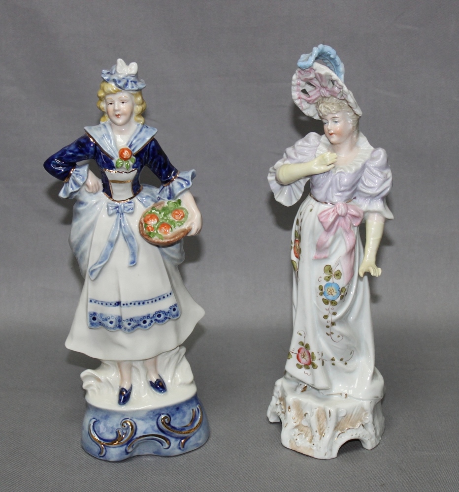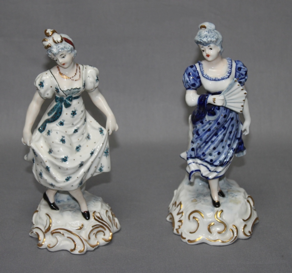 #57 Porzellan. Thüringer Porzellan. Zwei Frauen in festlicher Kleidung. Zwei unterschiedliche polychrome Porzellanfiguren in festlicher Kleidung. Auf der Unterseite jeweils mit Porzellanmarke “Radmarke“ (?) und unterschiedlichen Buchstaben (?). Produktion 2. Hälfte des 20. Jhrdts. Höhe jeweils 19,5 cm. (20)